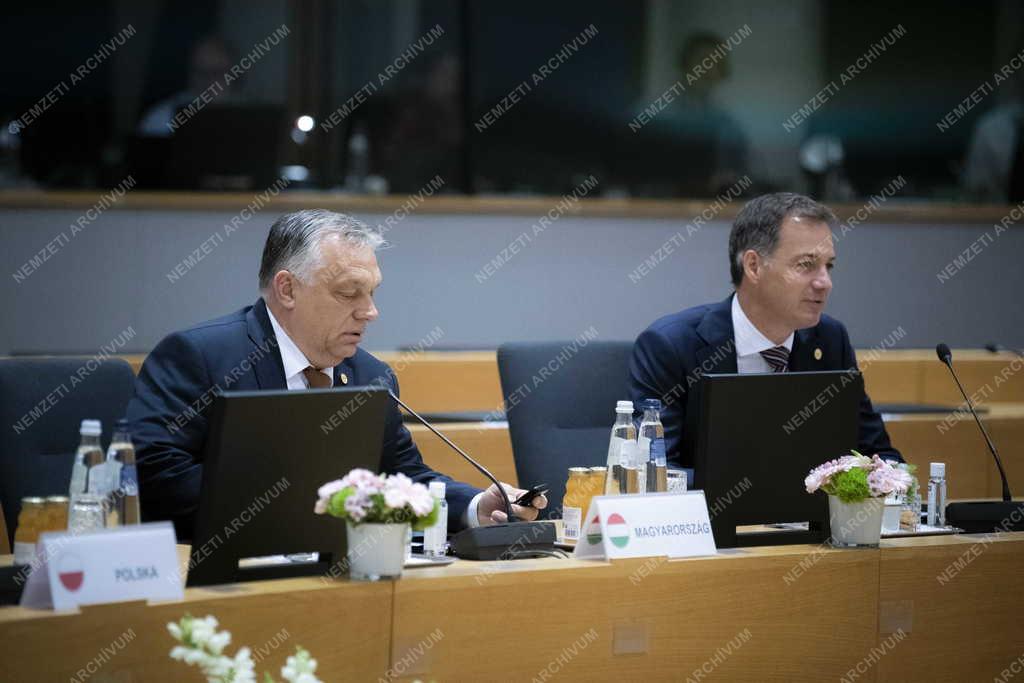 A Miniszterelnöki Sajtóiroda által közreadott képen Orbán Viktor miniszterelnök (b) és Alexander De Croo belga miniszterelnök (j) az EU kétnapos brüsszeli csúcstalálkozójának második napján 2022. június 24-én.