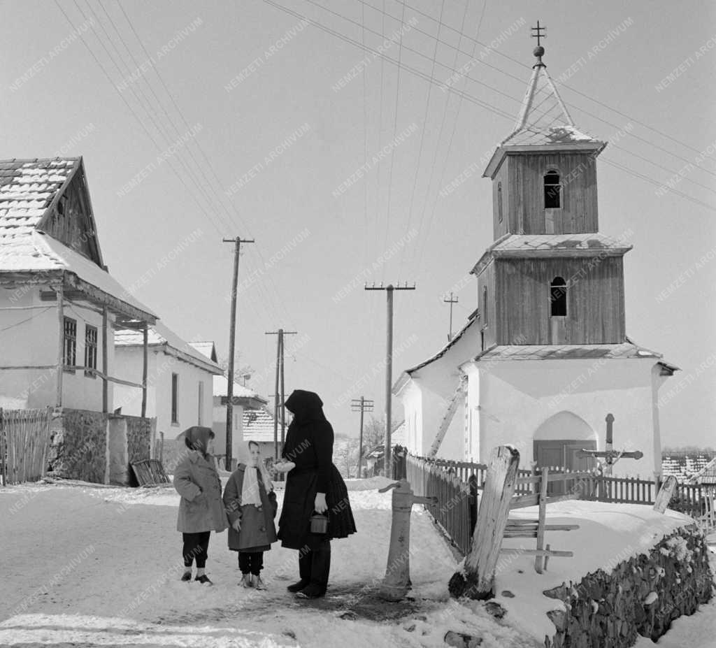 Parasztasszony gyerekekkel beszélget a Nógrád megye középső részén a Cserhát hegységben lévő település behavazott főutcáján. Jobbra az 1889-ben közadakozásból építtett fatornyos római katolikus templom.