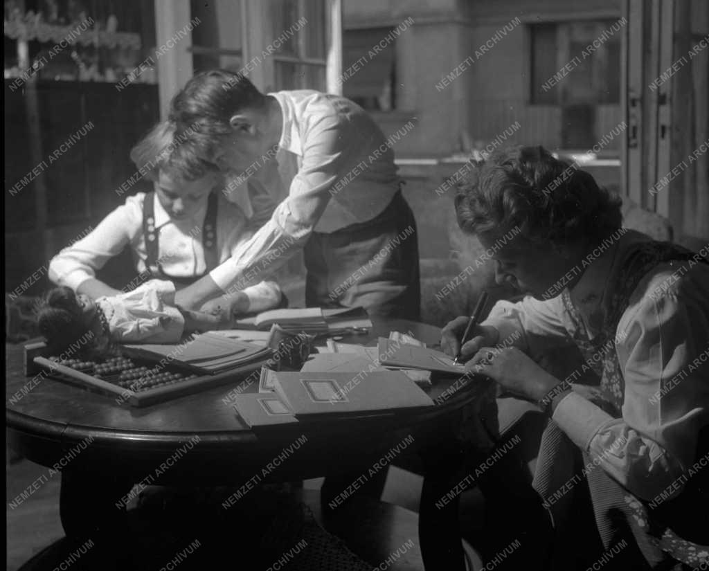 Várszegi Klári első osztályos tanulónak segít édesanyja, Várszegi Antalné és bátyja, Várszegi Péter bekötni az új füzeteket az új tanév kezdetekor.