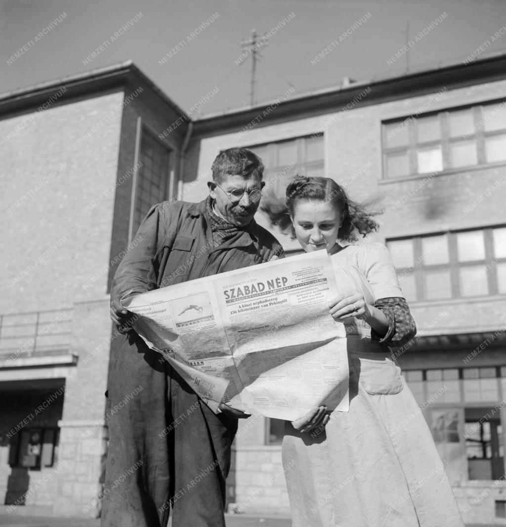 Szabad Népet olvasó munkások egy fővárosi üzem területén. A riport a Szabad Nép újság megrendelésére reklámanyagnak készült.