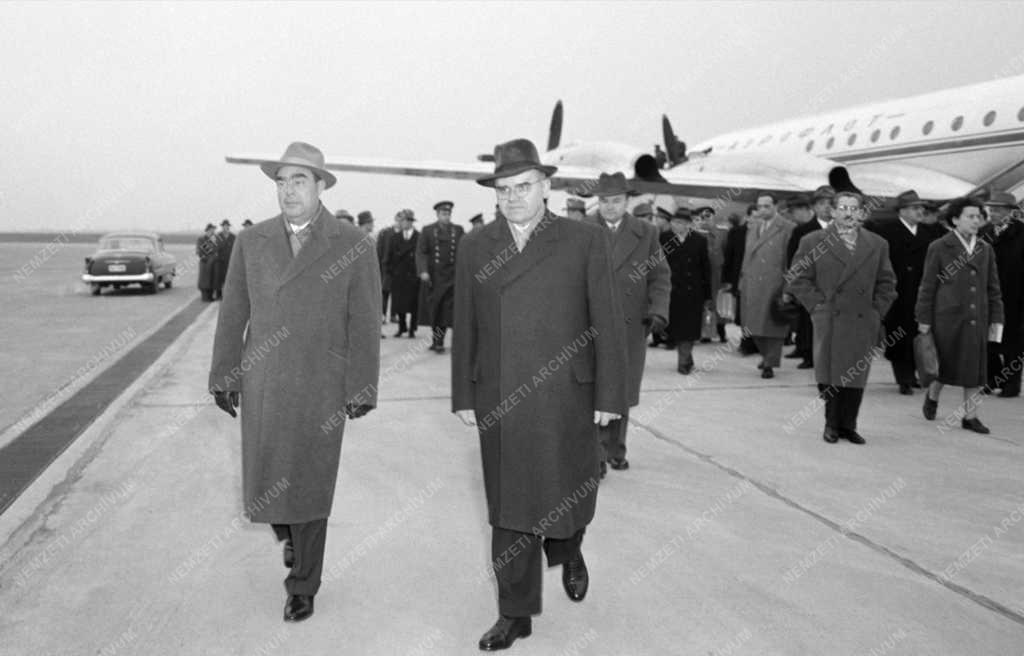 Leonyid Iljics Brezsnyev, a Szovjetunió Legfelső Tanácsa elnökségének elnöke (b), aki kíséretével a Guineai Köztársaságba tett hivatalos látogatásáról hazatérőben rövid időre leszállt IL-18-as repülőgépével a Ferihegyi repülőtéren, Kiss Károlynak, a Népköztársaság Elnöki Tanácsának elnök- helyettesének a társasáságában.