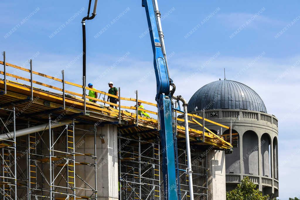 Betonszivattyú tölti fel a zsaluzatot. A 2700 négyzetméteres tetőtéri platform kialakításához 60 tonnás vasszerkezetet emeltek be a plasztikusan zsaluzott beton falakra. A debreceni Új Főnix Terv részeként 8,5 milliárd forintos beruházással épül a Nagyerdei Strand. Generál kivitelező a HUNÉP Universal Zrt.