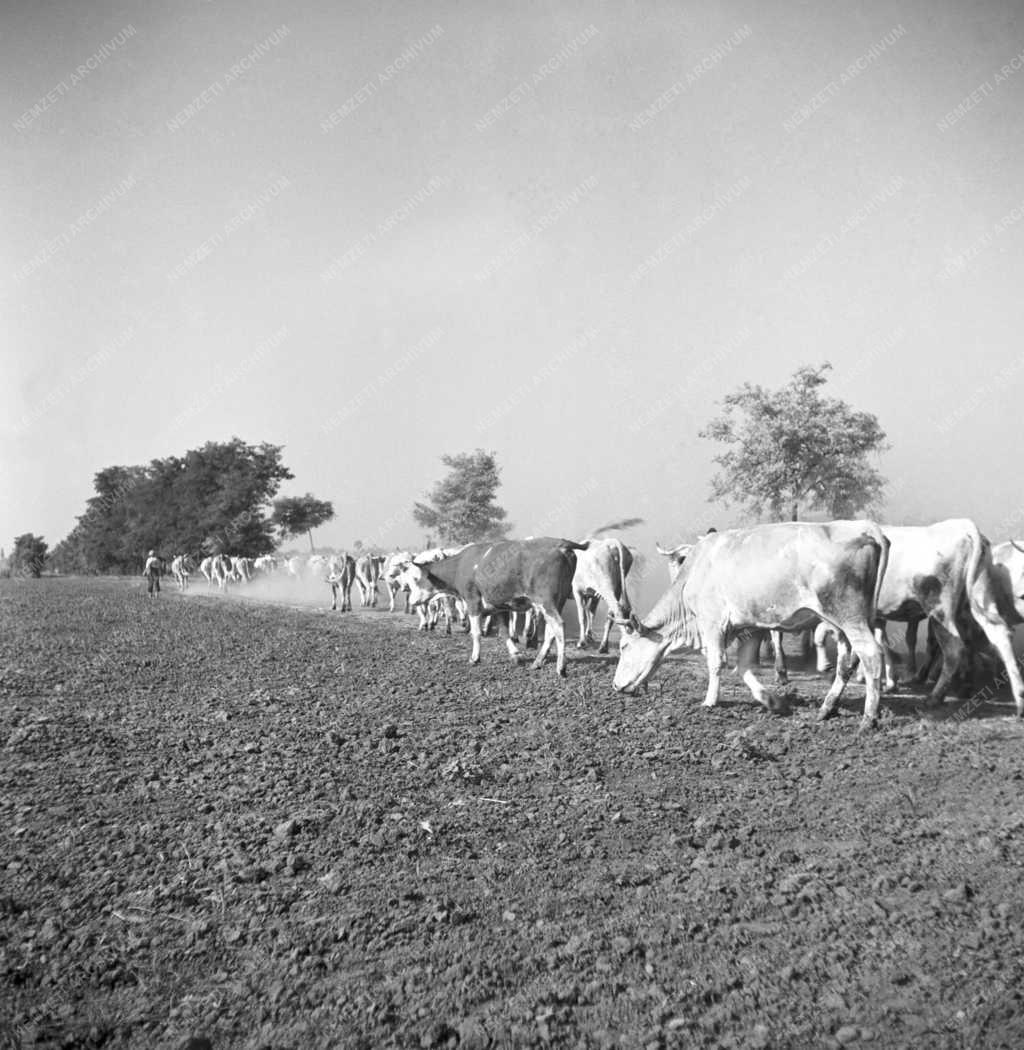 Szarvasmarhák mennek a szántóföld melletti poros úton. A teremlőszövetkezet száz férőhelyes istállójából a legelőre terelik az állatokat. A felvétel készítésének pontos helyszíne ismeretlen.