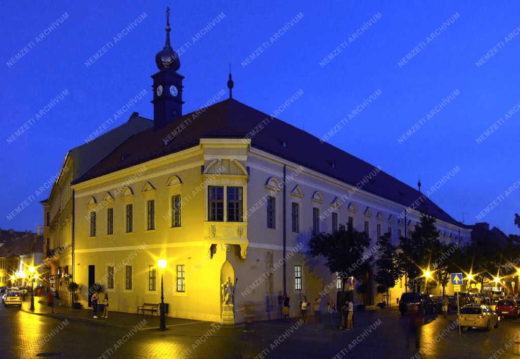 A budavári régi Városháza felújított műemlék épülete a főváros I. kerületében a Szentháromság téren, esti fényben.