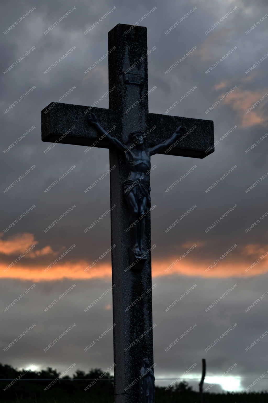 Az Orfű-Tekeresi temetőben lévő feszület naplementekor.