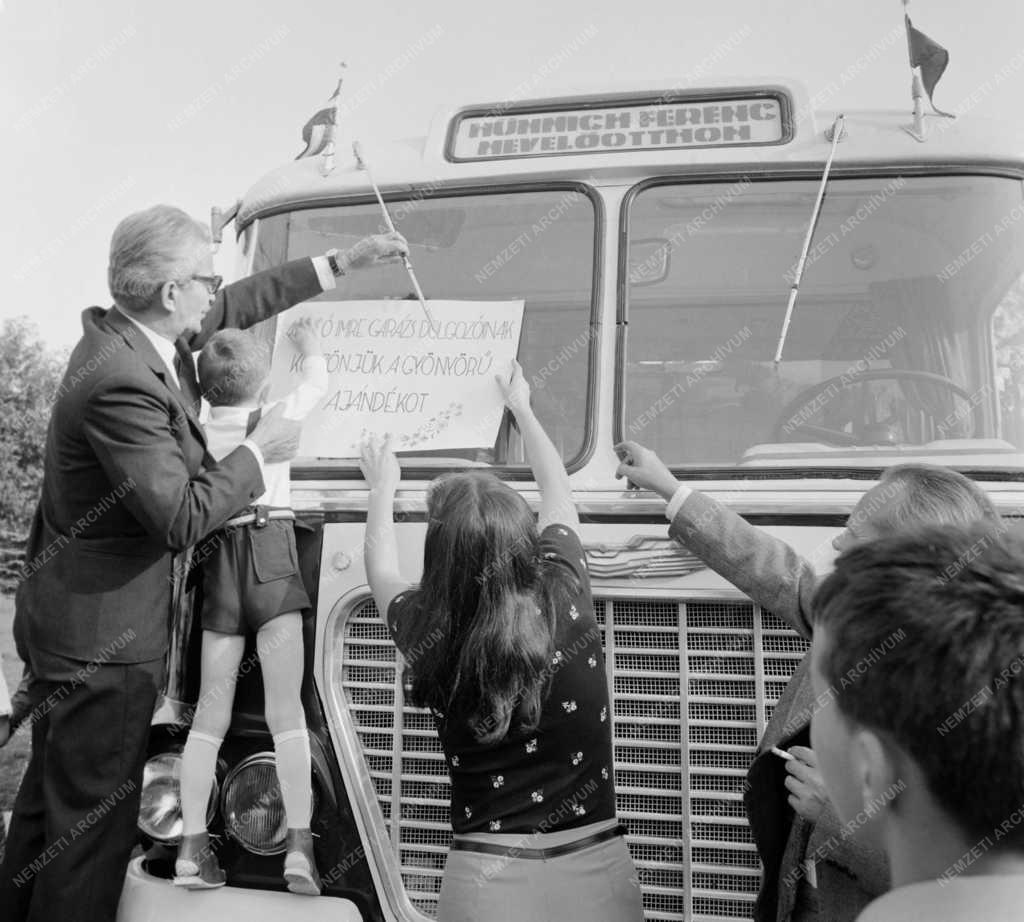 A II. kerületi Münnich Ferernc Nevelőotthon gyerekei kitűzik a szélvédőre köszönetük föliratát arra az ajándék autóbuszra, amit a BKV (Budapesti Közlekedési Vállalat) Mező Imre úti garázsának dolgozóitól kaptak.