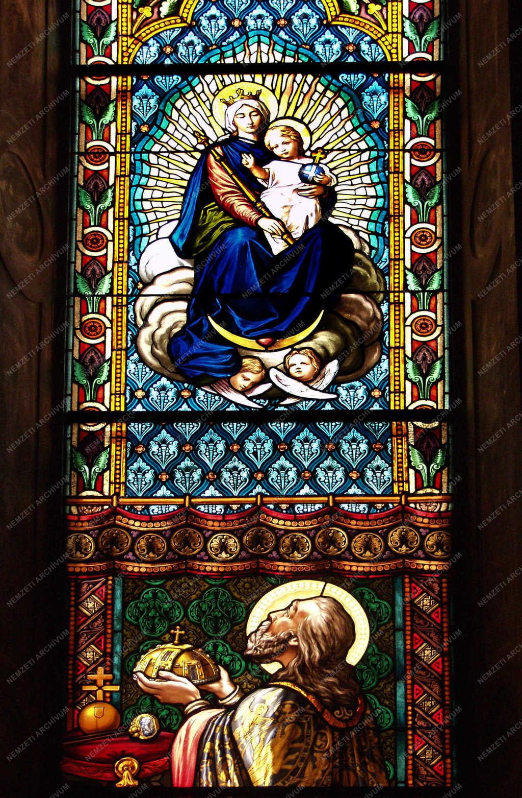 Ólomüveg ablak részlete a Pannonhalmi Bencés Főapátság épületében ( Szent István király felajánlja a Szent Koronát Szűz Máriának ).