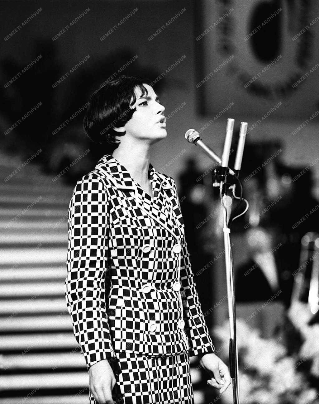 Zalatnay Sarolta táncdalénekes mikrofonba énekel az Erkel Színház színpadán, a Magyar Rádió és Televízió első táncdalfesztiváljának döntőjében .