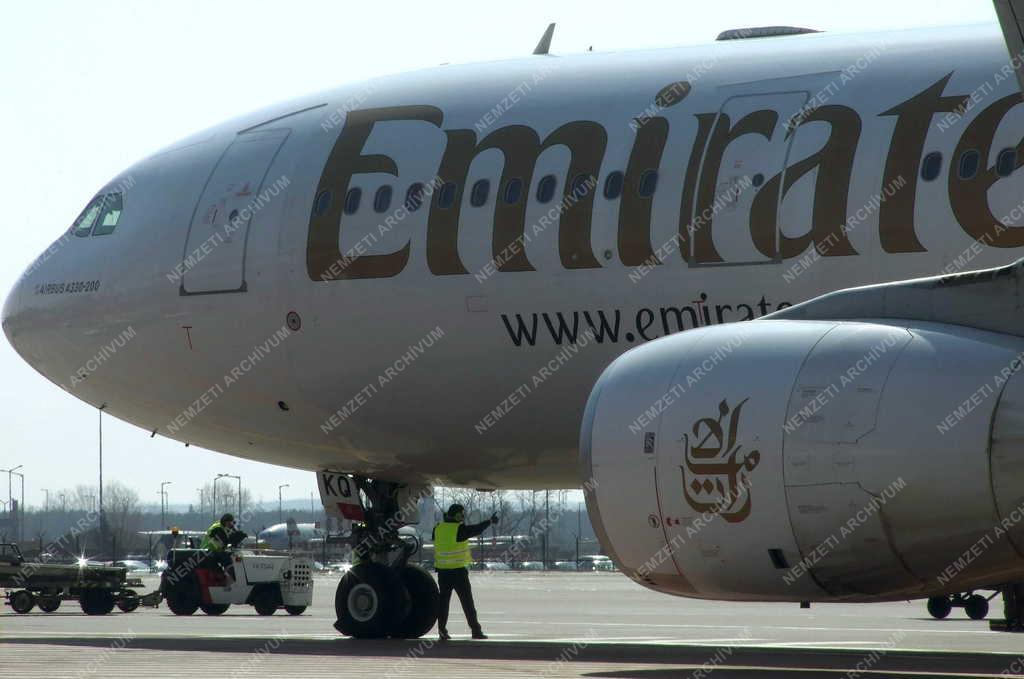 Repülőtéri dolgozók fogadják az Emirates Airline légitársaság A330-200 típusú repülőgépét a Budapest Liszt Ferenc Nemzetközi Repülőtér 2b. Termináljának betonján.