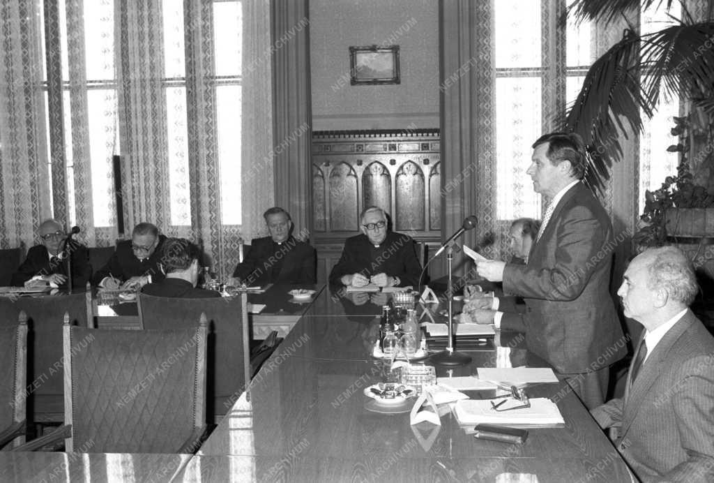 Németh Miklós miniszterelnök beszél október 20-án a Parlamentben, ahol megalakult az Országos Vallásügyi Tanács (OVT). Németh Miklós mellett jobbról: Glatz Ferenc művelődési miniszter, az OVT alelnöke, szemben Paskai László bíboros érsek (b4).