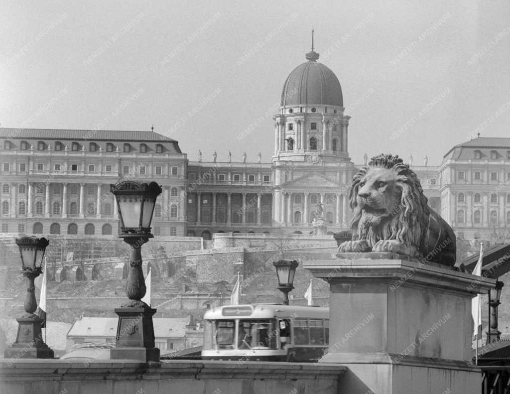 A második világháborúban megsérült és helyreállítás alatt lévő budai Várpalota az új kupolával. Az ország fővárosában nemcsak az új városrészek, modern új házak épülnek, hanem a régi műemlék épületeket is folyamatosan, korhűen restaurálják, valamint virágos parkok szépítik a várost. Előtérben a Lánchíd.
