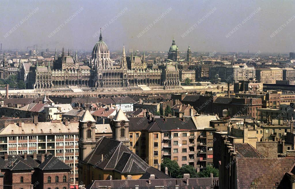 Látkép a fővárosra, az Express Ifjúsági és Diák Utazási Iroda Hotel Ifjúság elnevezésű szállodájától. A háttérben az Országház. Előtérben a Budapesti Országúti Szent István első vértanú templom a Mártírok útján.
