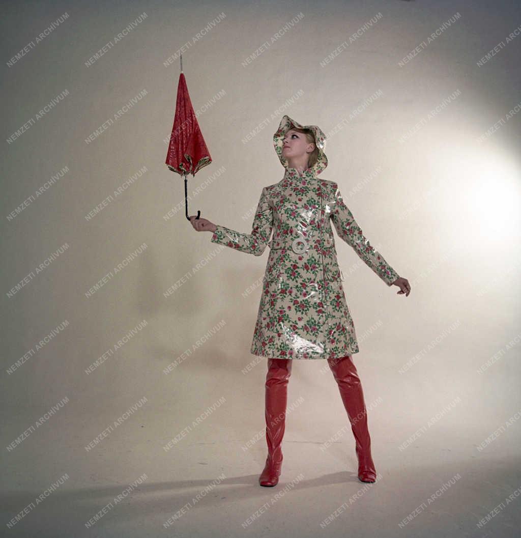 Bálint Magdolna manöken pózol a Győri Pamutszövő és Műbőrgyár új típusú alapanyagaiból készült divatruhában a műtermi felvételen.