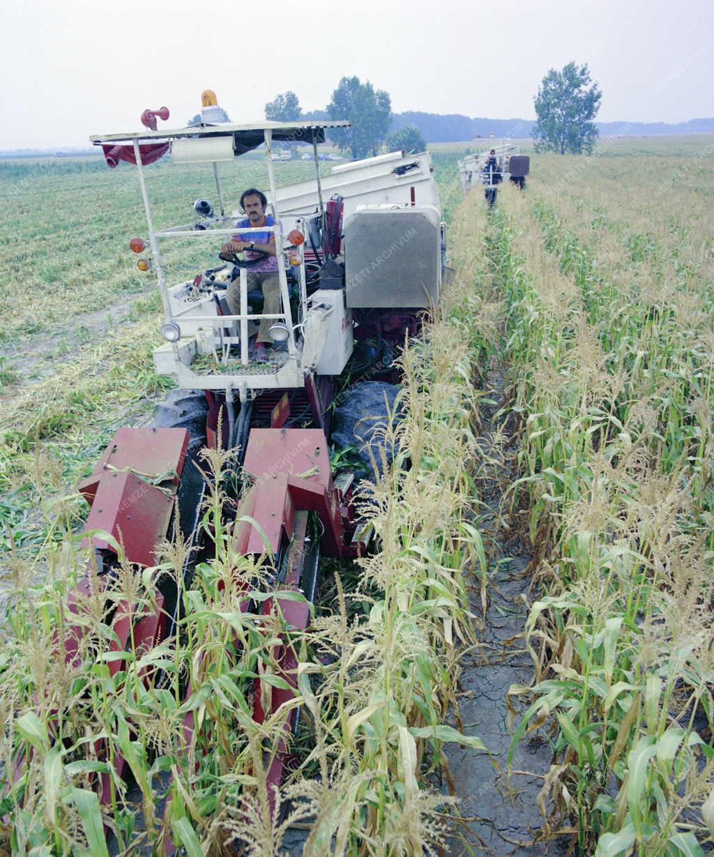 Aratógépre szerelt kukoricacső-törő adapterrel takarítják be a csemegekukoricát a Kalocsai Állami Gazdaságban.