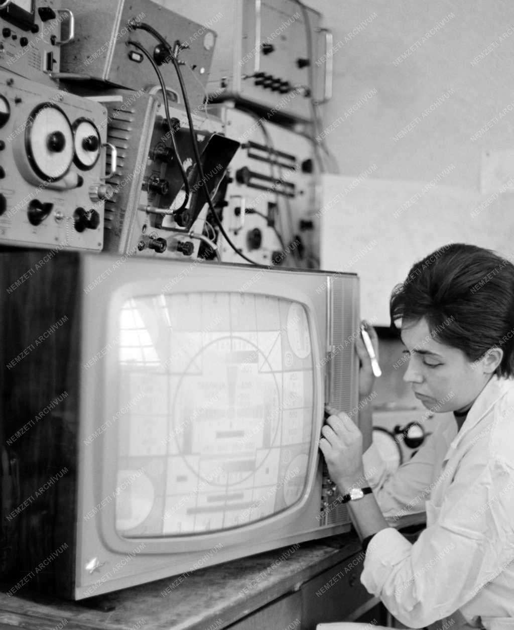 Dolgozó egy elkészült televíziókészüléket hangol egy híradástechnikai gyárban.
