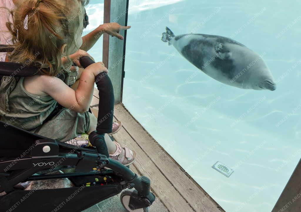 Egy látogató kisgyerek egy borjúfóka úszását figyeli a veszprémi állatkertben, hivatalos nevén a Kittenberger Kálmán Növény- és Vadasparkban, Magyarország harmadikként alapított állatkertjében lévő látványmedencénél.