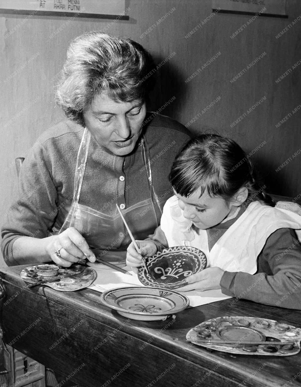 G. Harangozó Imréné festőművész tanítja Tamási Katalint a Városi Művelődési Ház cserépfestő szakkörében, ahol általános- és középiskolai diákok ismerkednek az iparművészettel.