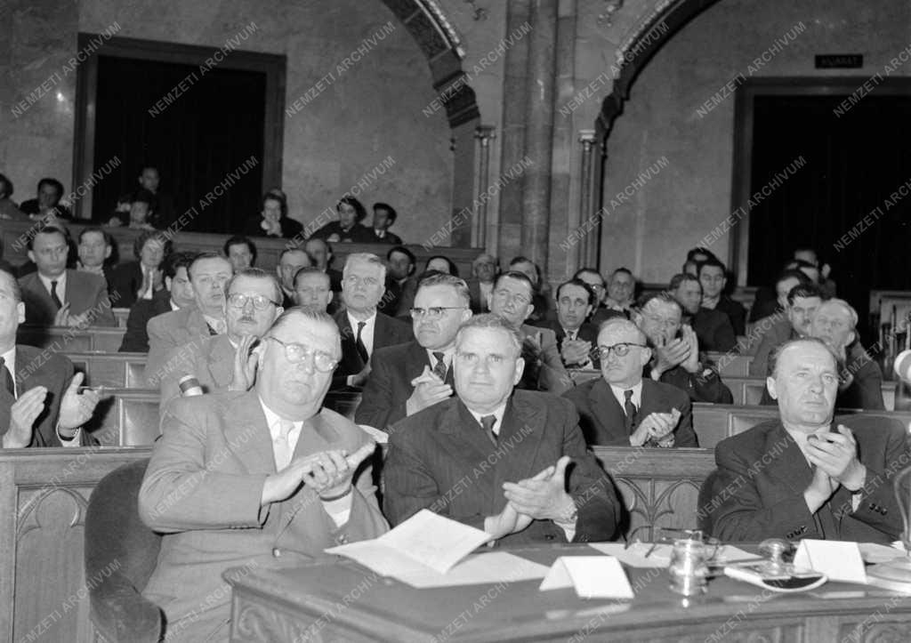 Tapssal fogadják a képviselők a Szovjetunió Legfelső Tanácsa VII. ülésszakának üdvözlő táviratát az Országgyűlés májusi időszakának második napján. Az első sorban dr. Münnich Ferenc, a miniszterelnök első helyettese, Dobi István, az Elnöki Tanács elnöke és Kádár János miniszterelnök (b-j), a második sorban középen Kiss Károly, az Elnöki Tanács tagja ül.