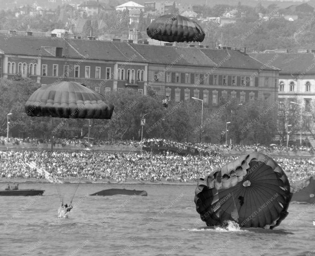 Ejtőernyős bemutató az Alkotmány napja alkalmából augusztus 20-án a Duna Parlament előtti szakaszán rendezett nagyszabású vízi- és légiparádén. Háttérben a közönség a budai parton.