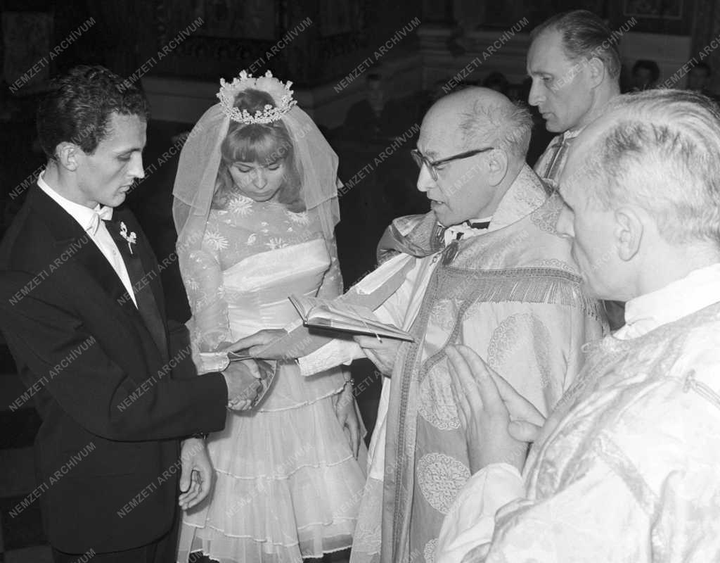 Albert Flórián labdarúgó és Bársony Irén színművésznő esküvője a Szent István-bazilikában, az eskető dr. Tarnóczy János címzetes prépost (j3).