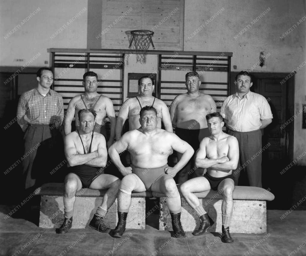 A közép-európai túrára készülő magyar professzionista birkózók a X. kerületi Ihász utcai iskola tornatermében, hátsó sor (b2-j): Mángó Andor, Radu Lukács Lajos edző, Tanamár és Növényi, első sor (k-j): Sümegi és Gáspár.
