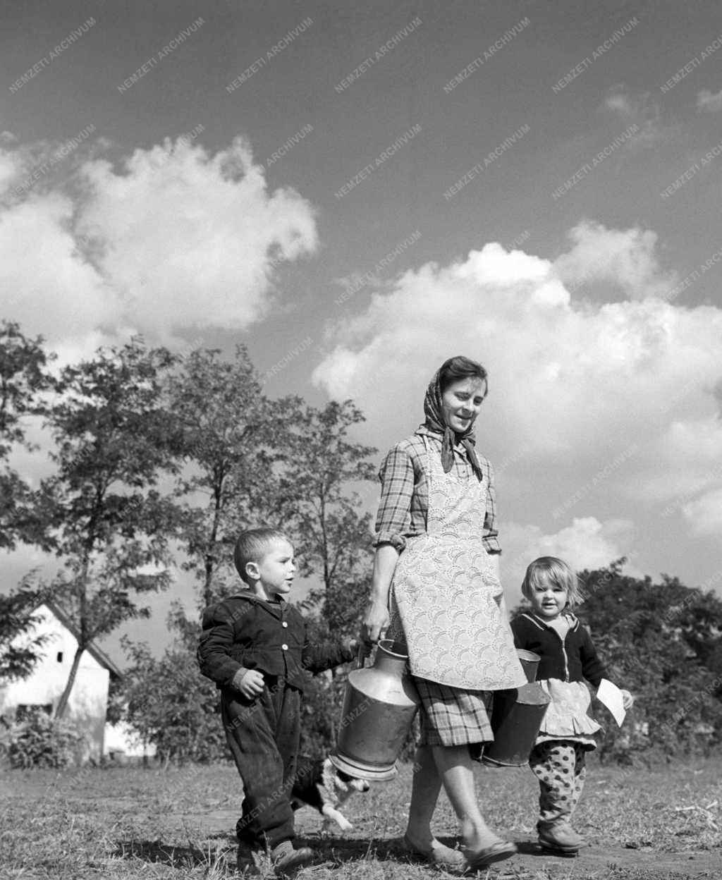 Anya gyermekeivel vízért sétál.
