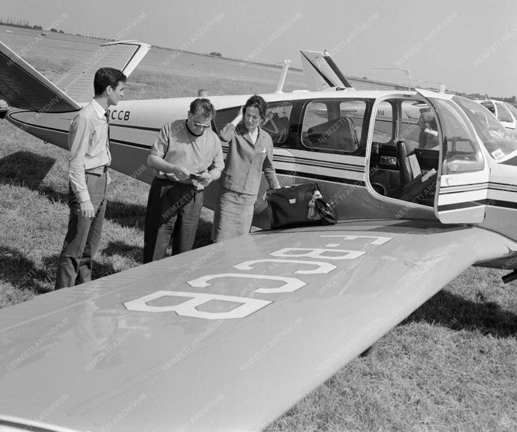 Landolás után a budaörsi repülőtéren. A Nemzetközi Repülőszövetség (FAI-Fédération aéronautique internationale) fennállásának 60. évfordulója tiszteletére Európa körüli túrát szervezett 11 ország 303 pilótájával. Split, Szófia, Várna, Konstanca, Bukarest és Arad után a rendezvény keretében 117 magánrepülőgép érkezett Budapestre. A pilóták a főváros nevezetességeivel ismerkednek, hajókiránduláson vesznek részt, majd ismét útra kelnek és Bécs, Salzburg, München lesz a három befejező állomás.