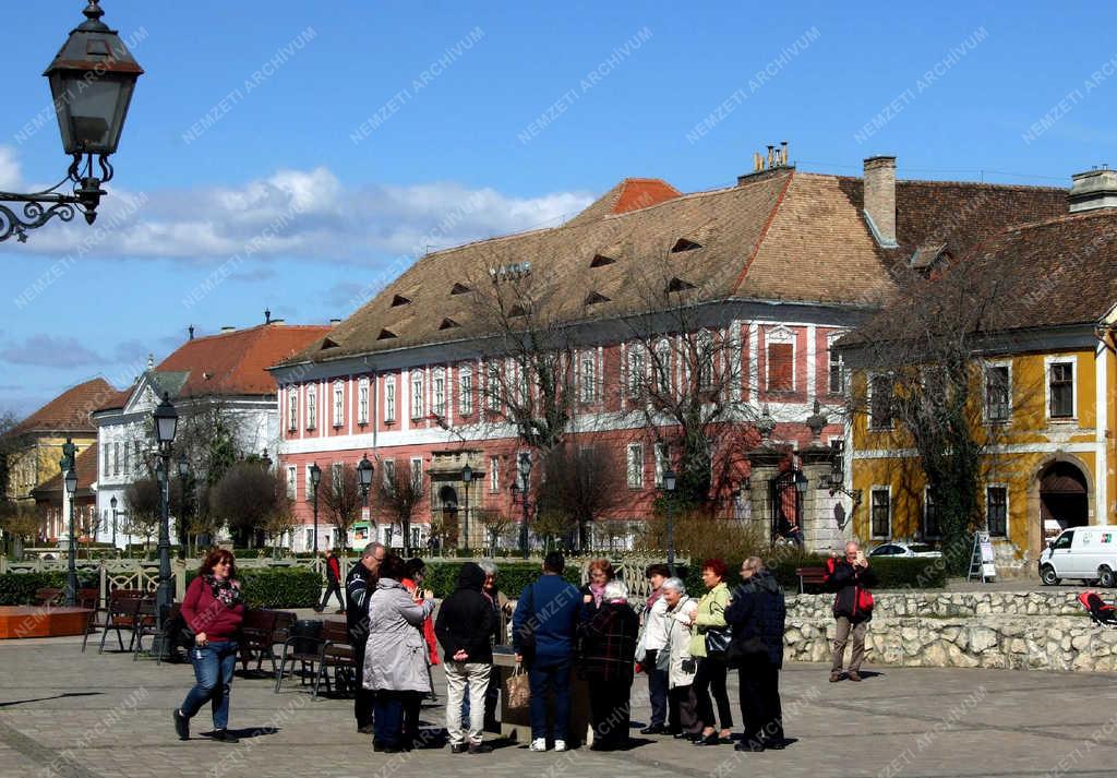 Belföldi turistacsoport tagjai idegenvezetőjüket hallgatják a Március 15. téren a városközpontban. Hátttérben a 18. század elején épült egykori püspöki palota (rózsaszín) műemlék épülete, ugyancsak védett lakóházak és paloták sorában.