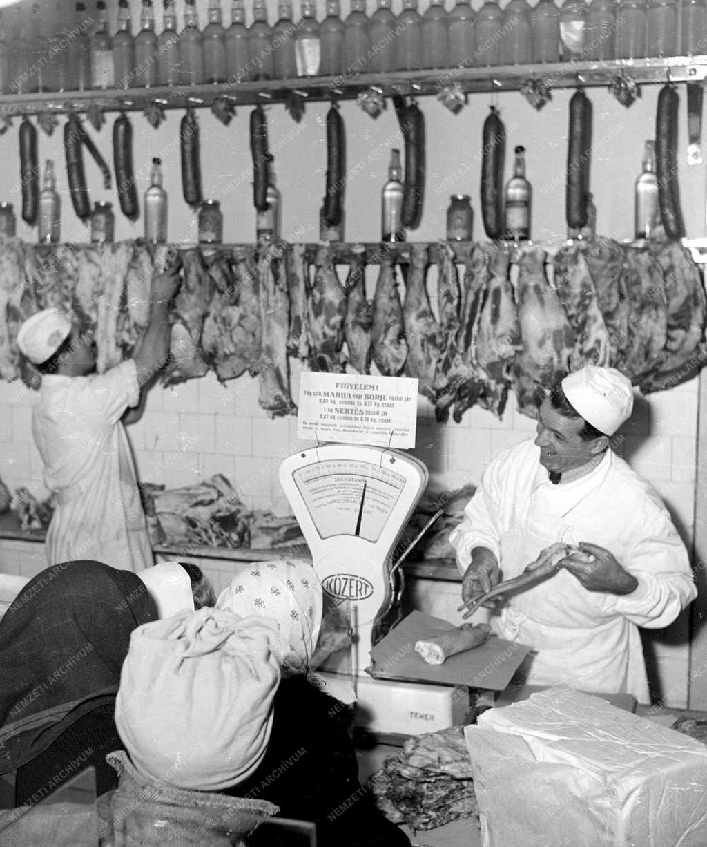 Wizler Sebők árubevezető és Bárdos Géza eladó dolgozik a budafoki 22108. számú Húsért üzletben.