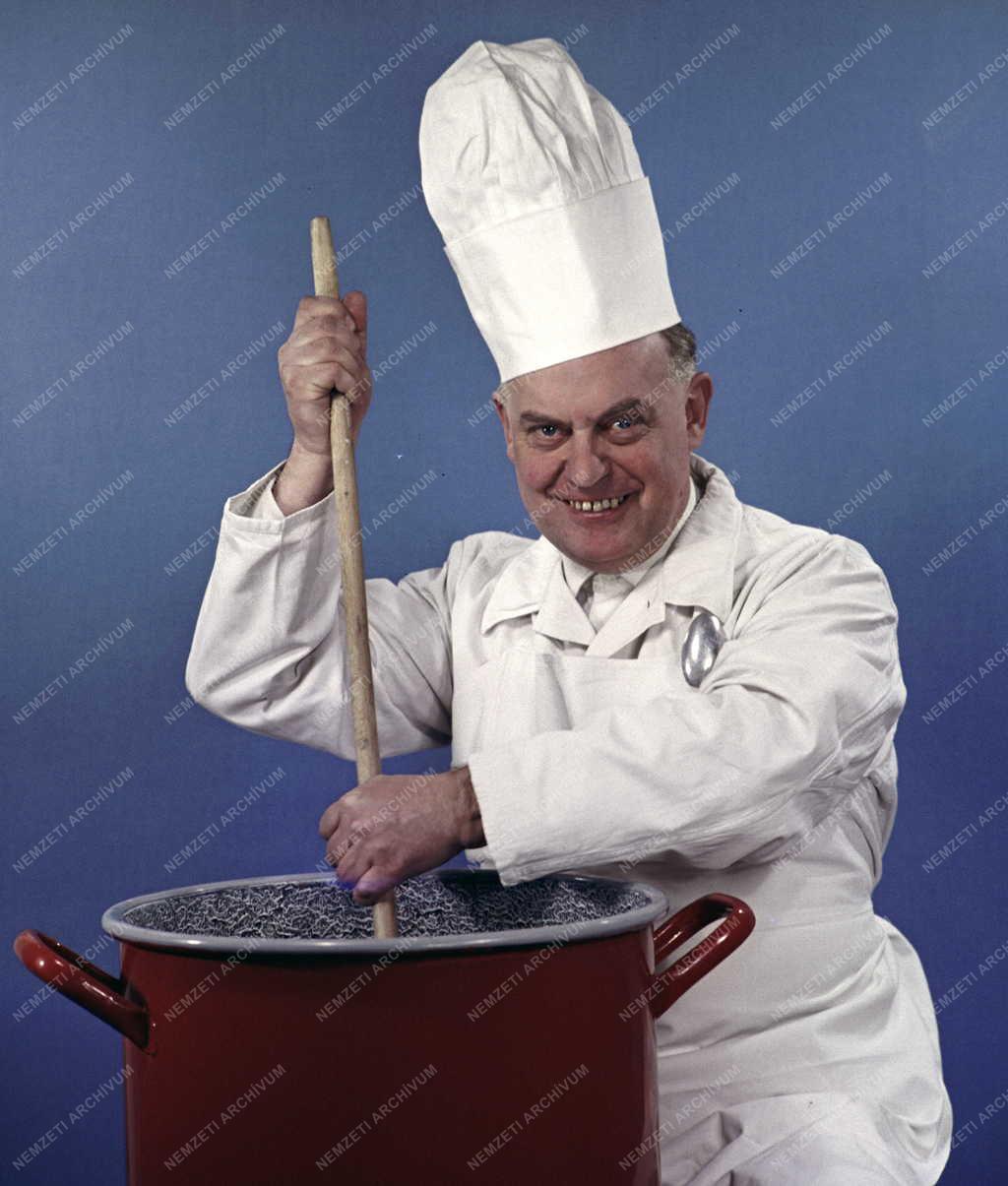 Egy szakácsruhába öltözött férfi konyhai eszközöket reklámoz a Műszaki Árut Értékesítő Vállalat (MÜÁRT) számára készült műtermi fotón. A felvétel készítésének pontos helye ismeretlen.