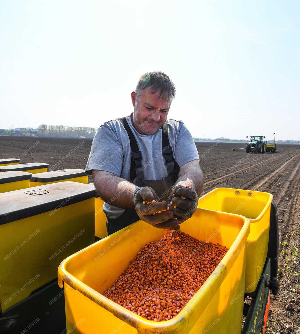 Balogh Zsolt a vetőmagot nézi. A debreceni Agrárgazdaság Kft-ben 2 héttel korábban kezdték a kukorica vetését, elsősorban saját és hazai nemesítésű vetőmag használatával.