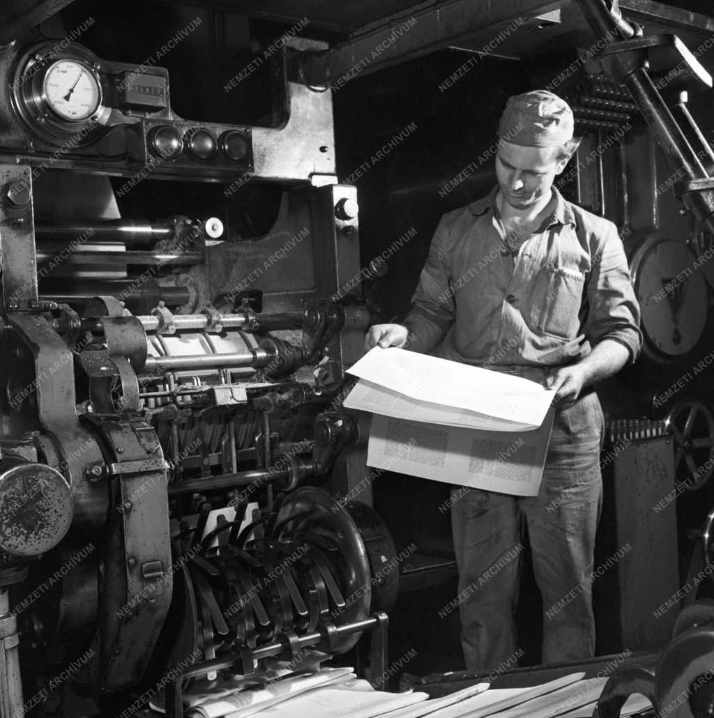 Krajcár Ferenc, a Szikra Lapnyomda csoportvezető gépmestere a nyomtatást ellenőrzi próbanyomás közben.