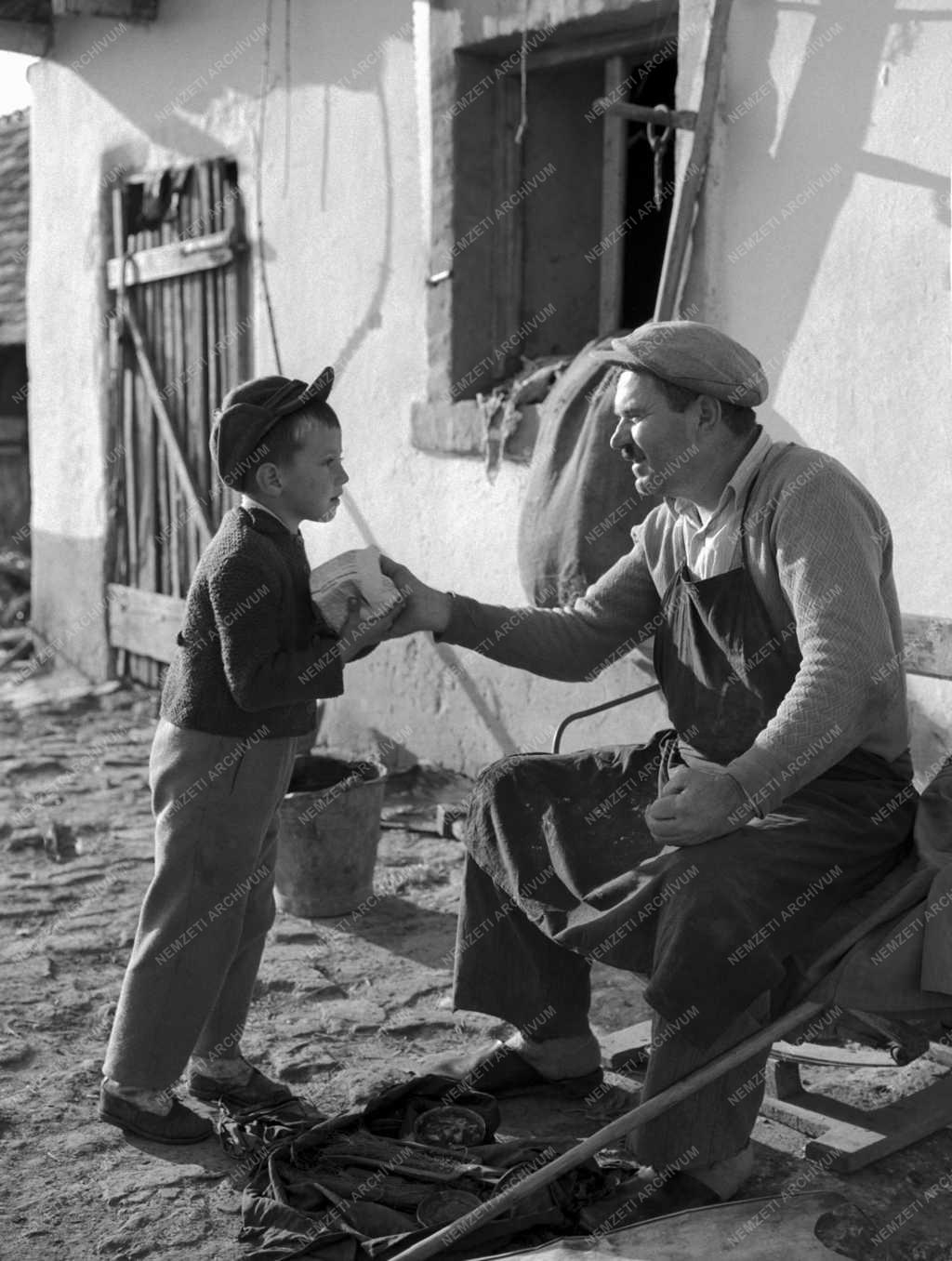 Az egykori uradalmi kocsis Rühl Henrik - aki földosztáskor hathold földet kapott és egy kétszobás házat épített magának - egy csomagot ad át Müller Sándor kisfiúnak.