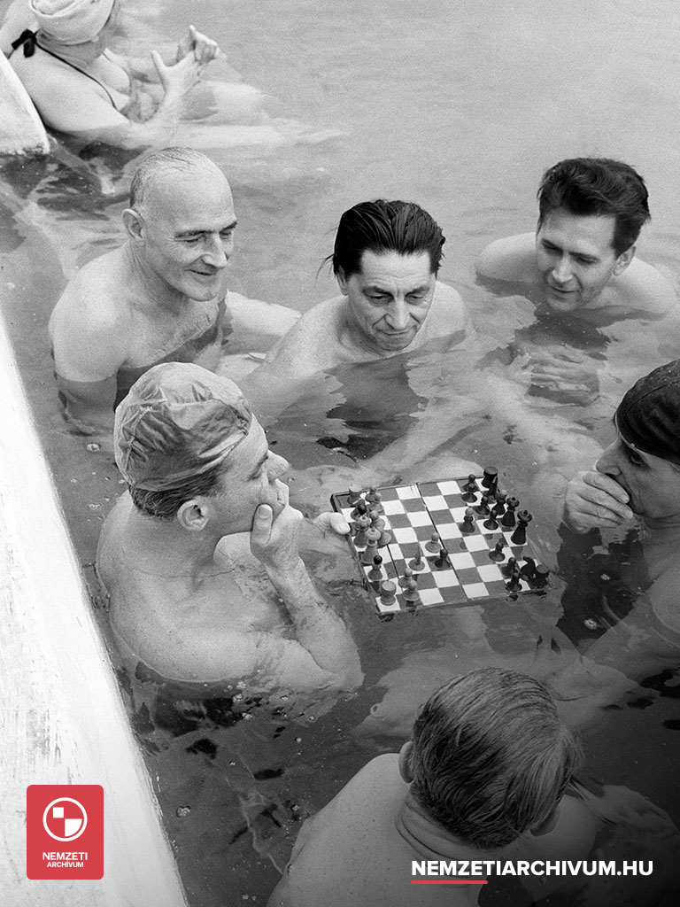 - Sakkozók a Szabadság Strandfürdő medencéjében (MTI Fotó: Horling Róbert)