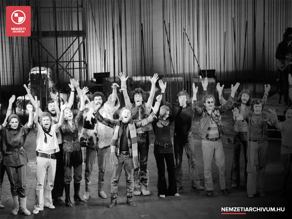 - Tahi Tóth Lászlóval a Képzelt riport egy amerikai popfesztiválról című musicalben (MTI Fotó: Keleti Éva)