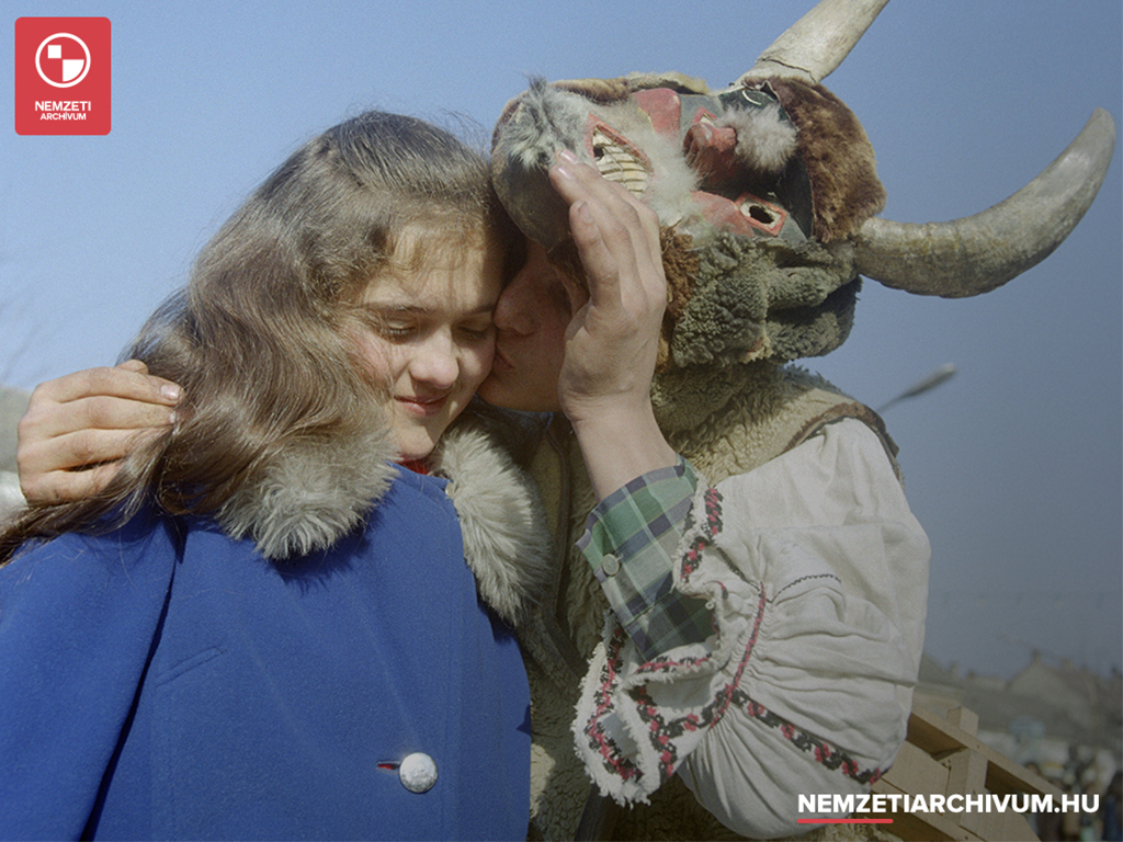 - Maszkos busó búcsúzik kedvesétől maszkját felemelve a mohácsi busójáráson (MTI Fotó: Fényes Tamás)