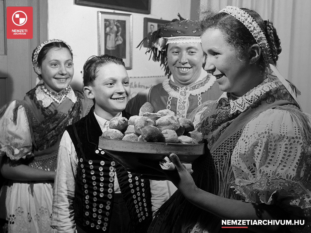 - A farsangi népszokás szerint fiatalok frissen sült farsangi fánkkal kínálják egymást, viseletük palóc népviselet (MTI Fotó: Bereth Ferenc)